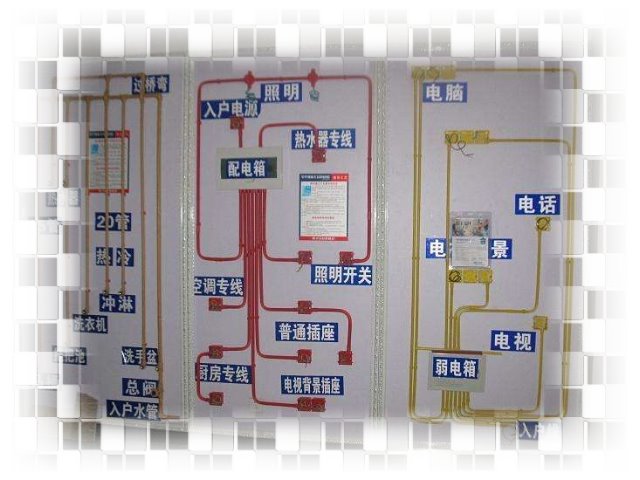 7,水电安装课程:家装水路常用工具。水路施工常用材料及图纸识读。水路管道的安装及要求。水路施工中的附件及洁具安装。家装电路基础知识及常用工具。家装电路常用工具。电路施工常用材料。电路施工图纸识读。家装电路中常用线路的铺设。开关和插座的安装。灯具的安装。其他用电设备的安装。水路、电路安全注意事项,前期水电线路布局设计、电路布线施工、水路施工、网线电话线布线施工、开槽技术、完工打压验收水路打压方法、卫浴洁具安装、后期开关面板安装、灯具安装及调试。水电工工具的名称和使用方法(角磨机的操作方法、热熔机的使用、电锤电铲的使用、打压机的操作方法、万用表、摇表、红外线水平仪、短路侦察器等仪表的使用方法)。家装常用水管电线的规格和材质(20、25、ppr、pvc、铝塑管、2.5平方电线、4平方电线的使用场合及讲解)。水路电路布局设计,水管熔接,水龙头的安装,电路的安全操作方法,电线的穿线方法,电锤使用方法,水路电路检测。开槽安全知识及要领,冷热水分布,水管弯头的熔接电线的接头处理,热熔机使用方法,打压机操作方法,家装水电工完工验收标准。